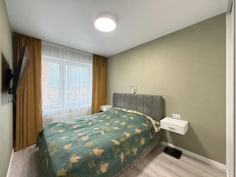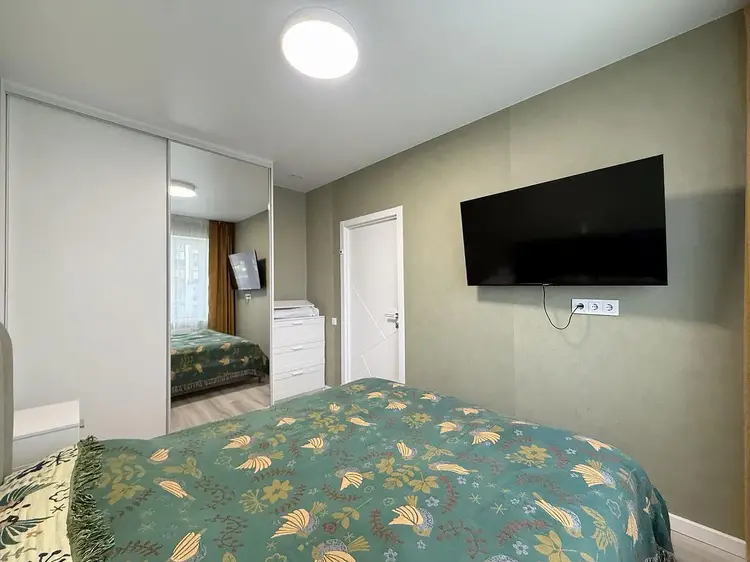 Изолированная спальня оснащена кроватью с подъёмным механизмом, прикроватными тумбочками и вместительным шкафом купе.