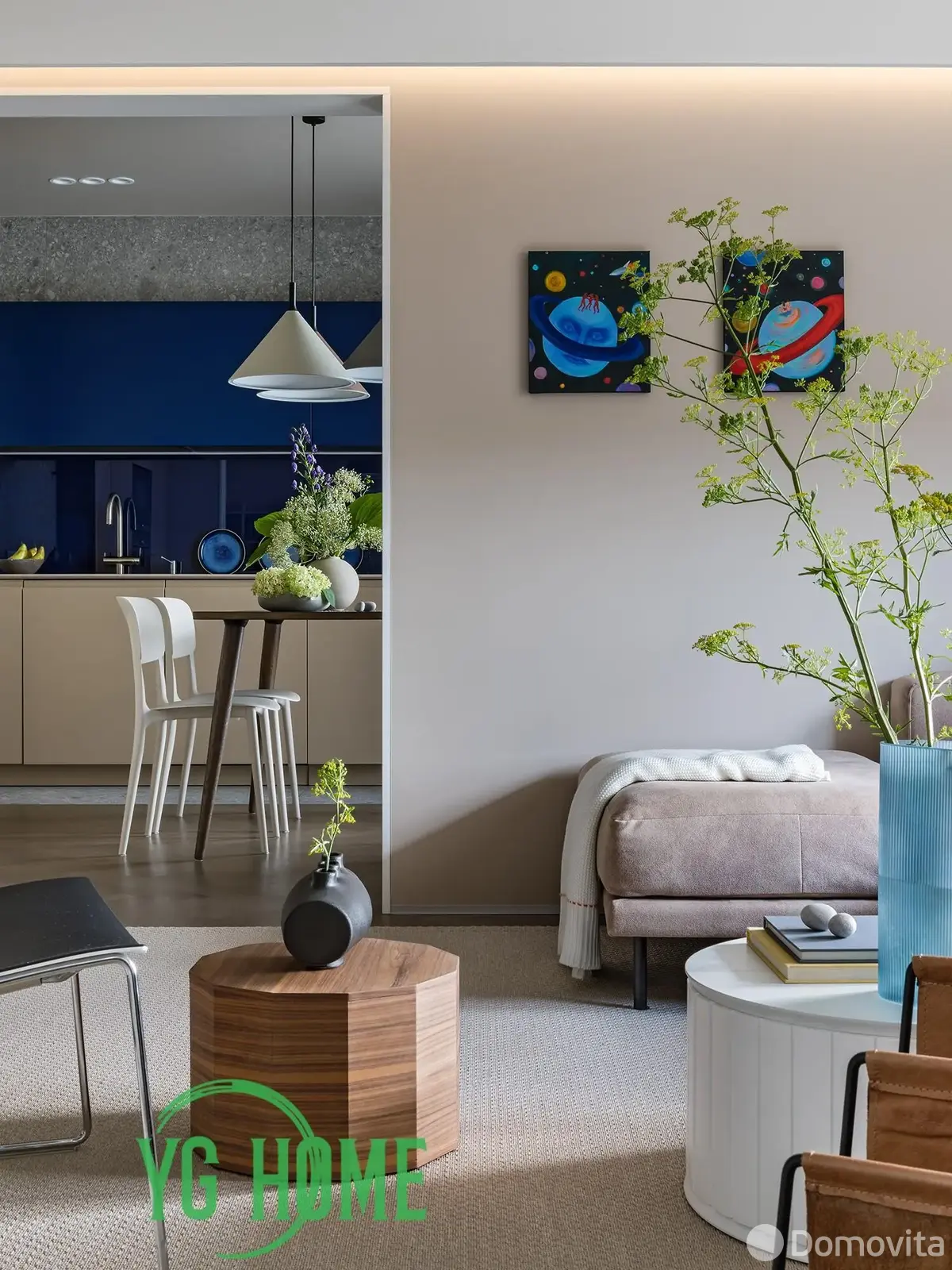 Просторная гостиная, спальня, рабочий кабинет (либо детская комната), кухня, ванная комната, туалет, отдельная постирочная, лоджия и коридор. Квартира выходит на две стороны: рассвет встречает в спальне, закат – в гостиной с видом на тихий и уютный двор.