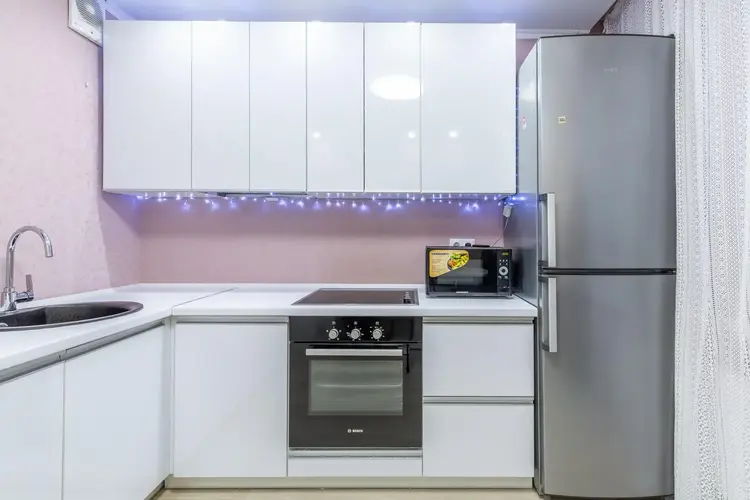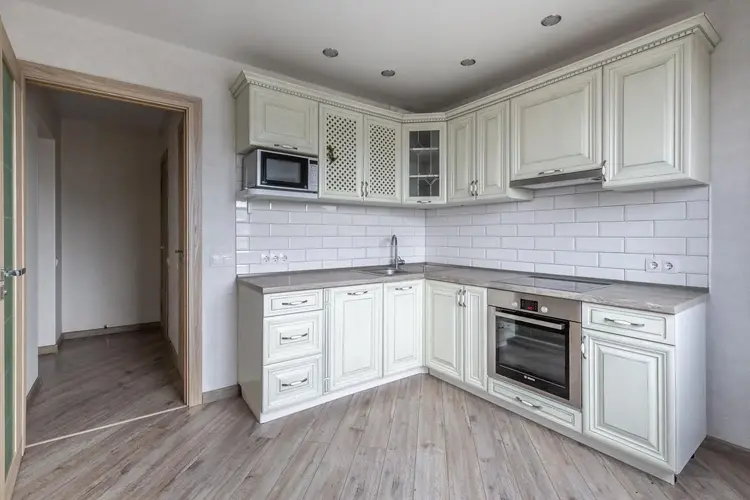 Полная комплектация техникой: духовой шкаф, варочная панель, вытяжка, посудомоечная машина, стиральная машина.