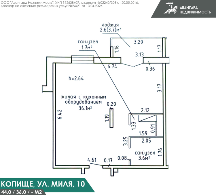 Площадь по СНБ кв. 44.0 м.кв. высота потолков 2.64 м., окна по всей квартире панорамные двустворчатые. Разведена электрика.