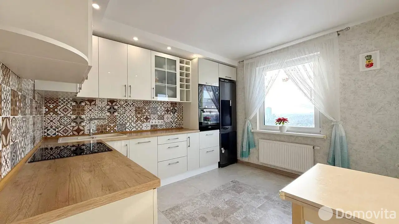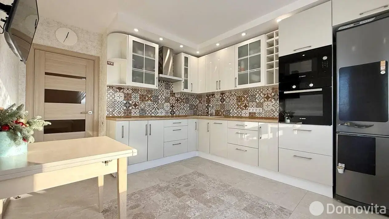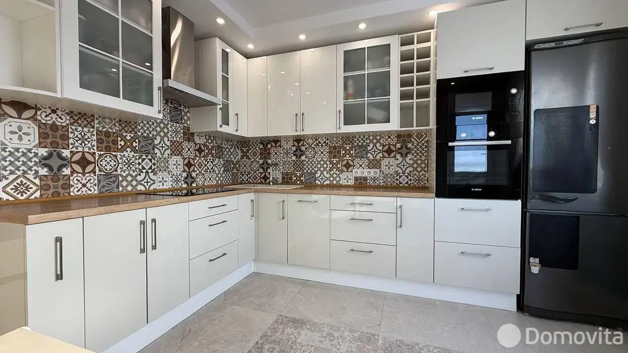 Кухня оборудована техникой Bosch — посудомойка и индукционная плита. Кухонные шкафы выполнены из крашеного МДФ с фурнитурой Blum, а также доводчиками. Вытяжка Сiarko с четырьмя режимами работы и подсветкой.