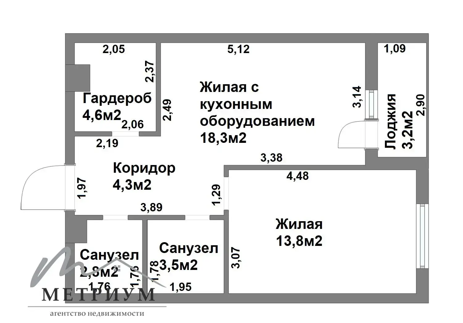 Огромным плюсом квартиры является наличие большой гардеробной, куда можно разместить всю систему хранения для всей семьи, что сохранит место в жилых комнатах. Либо, сделав небольшую перепланировку - добавить ещё одну полноценную комнату!