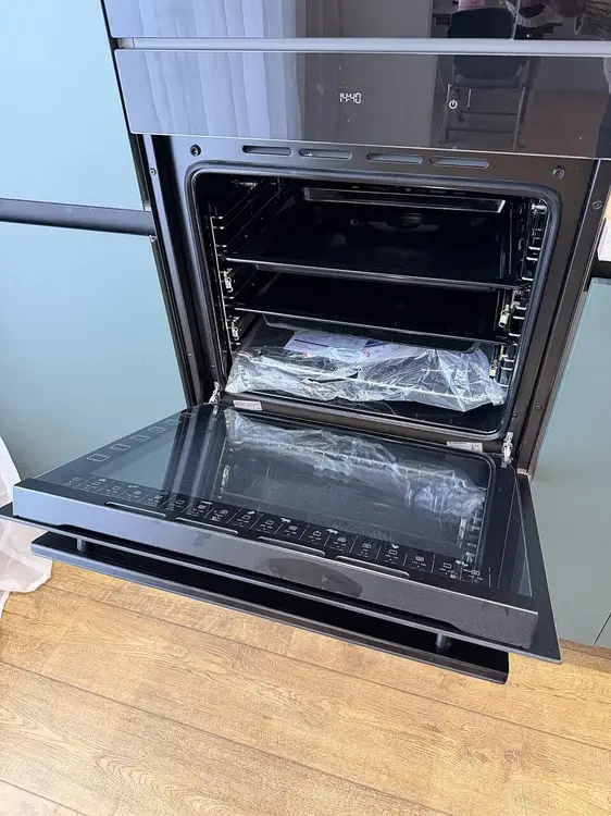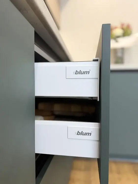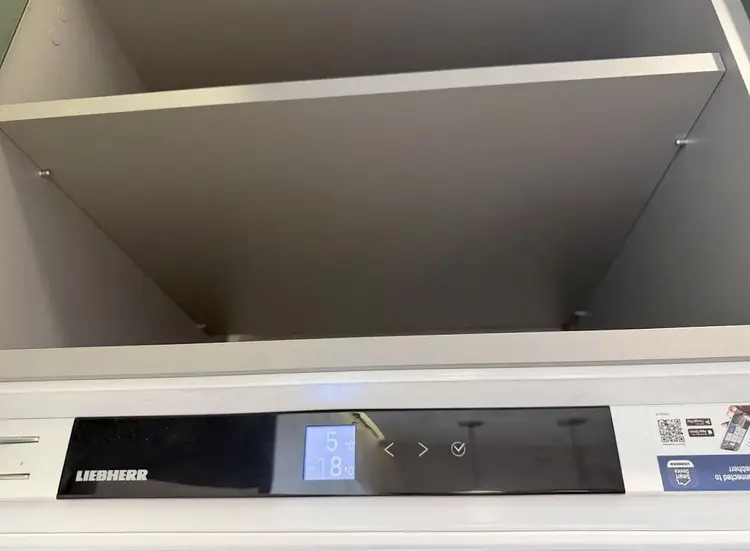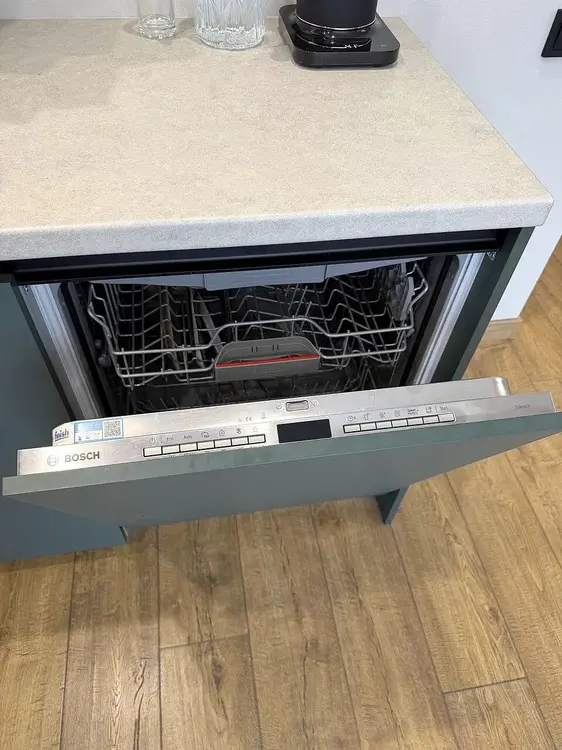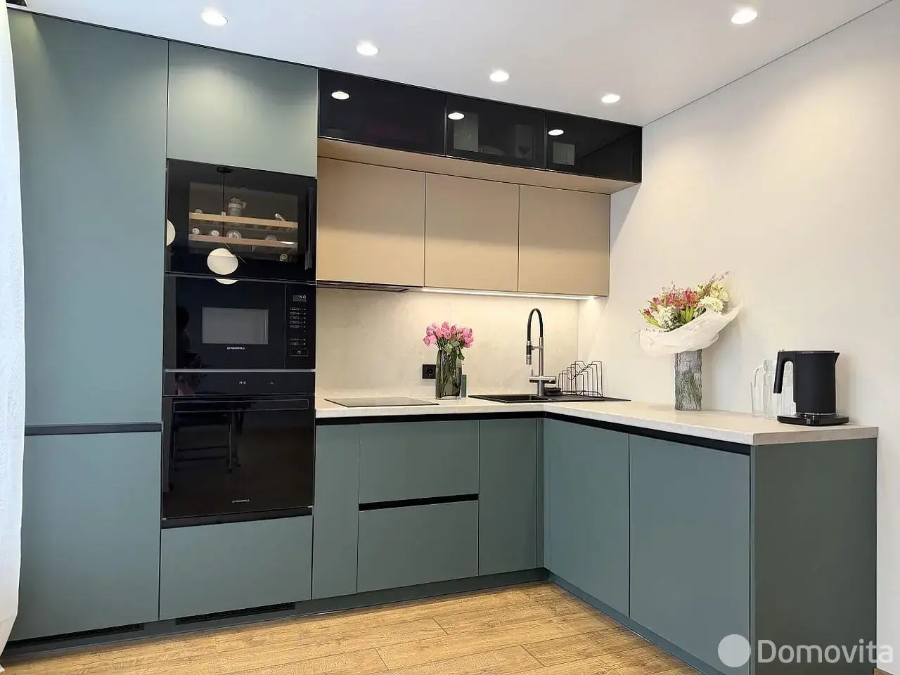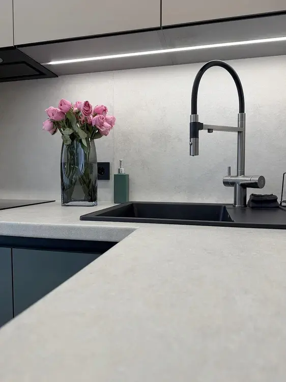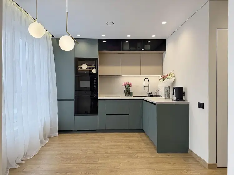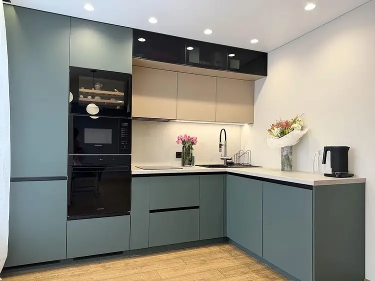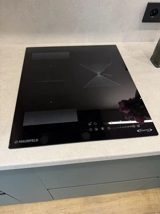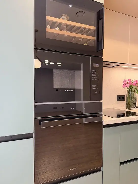 Встроенная кухня с доводчиками Blum, подсветкой рабочей зоны и техникой (индукционная варочная поверхность, духовой шкаф, встроенная СВЧ-печь, винный шкаф и вытяжка Maunfeld, холодильник Liebherr, посудомоечная машинка Bosch).