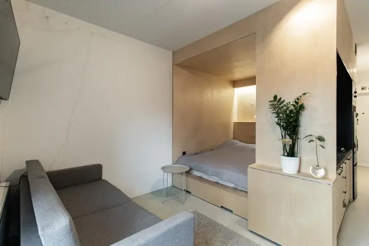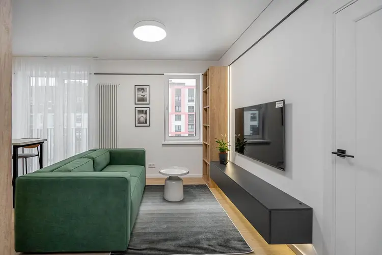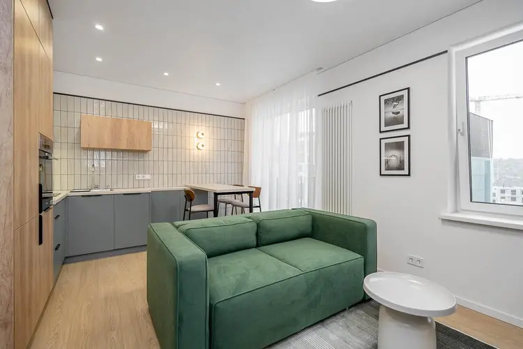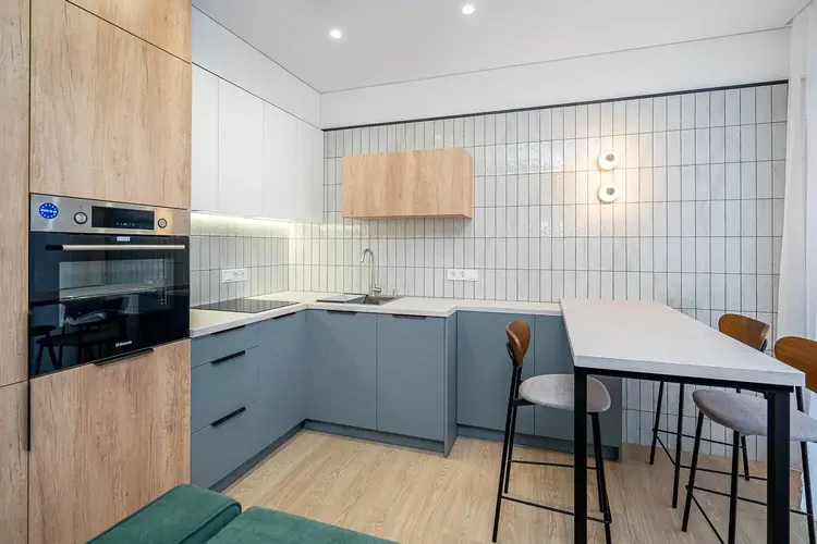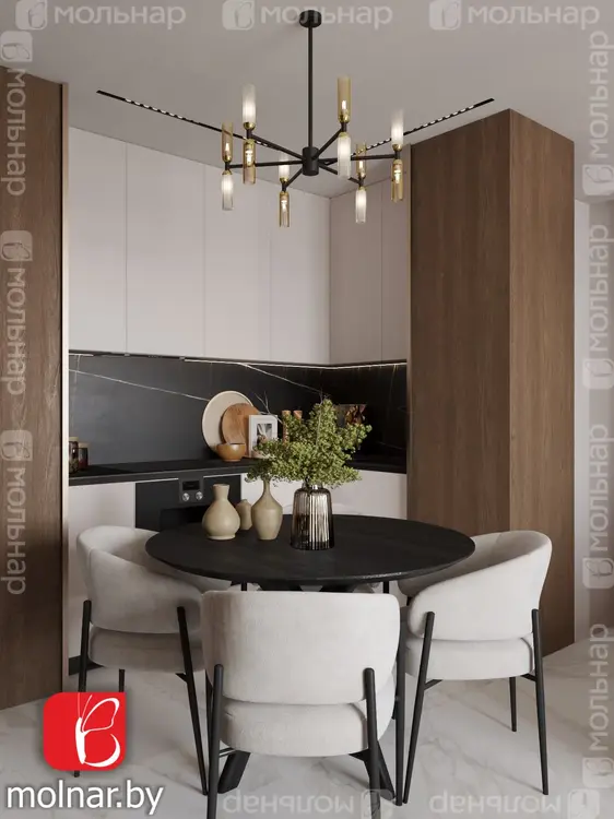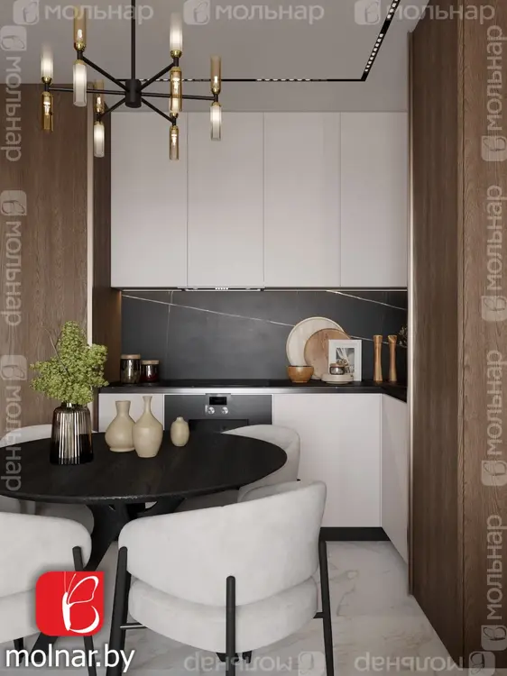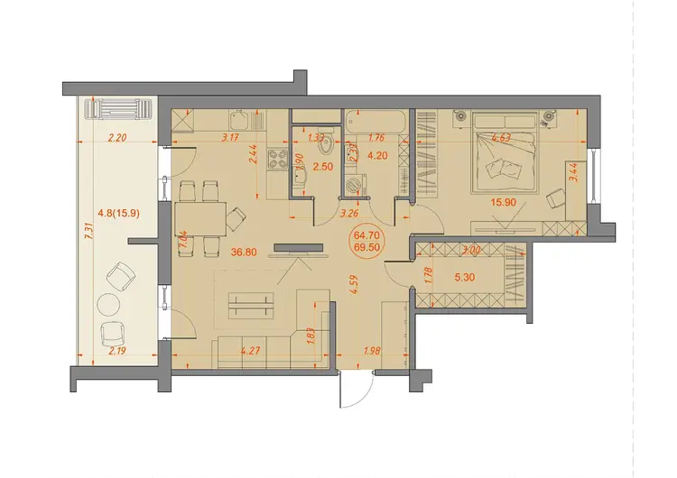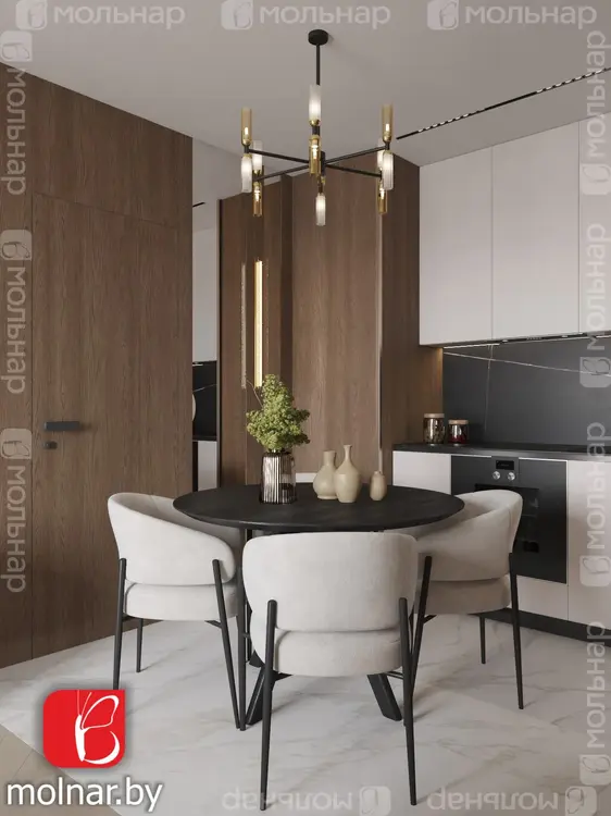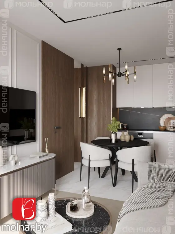 С учетом метража квартиры в 43,3 кв.м. по СНБ планировка очень удобная и эргономичная. Кухня-гостиная выполнена с зонированием рабочей зоны и зоны отдыха. В спальне обустроена отдельная просторная гардеробная.