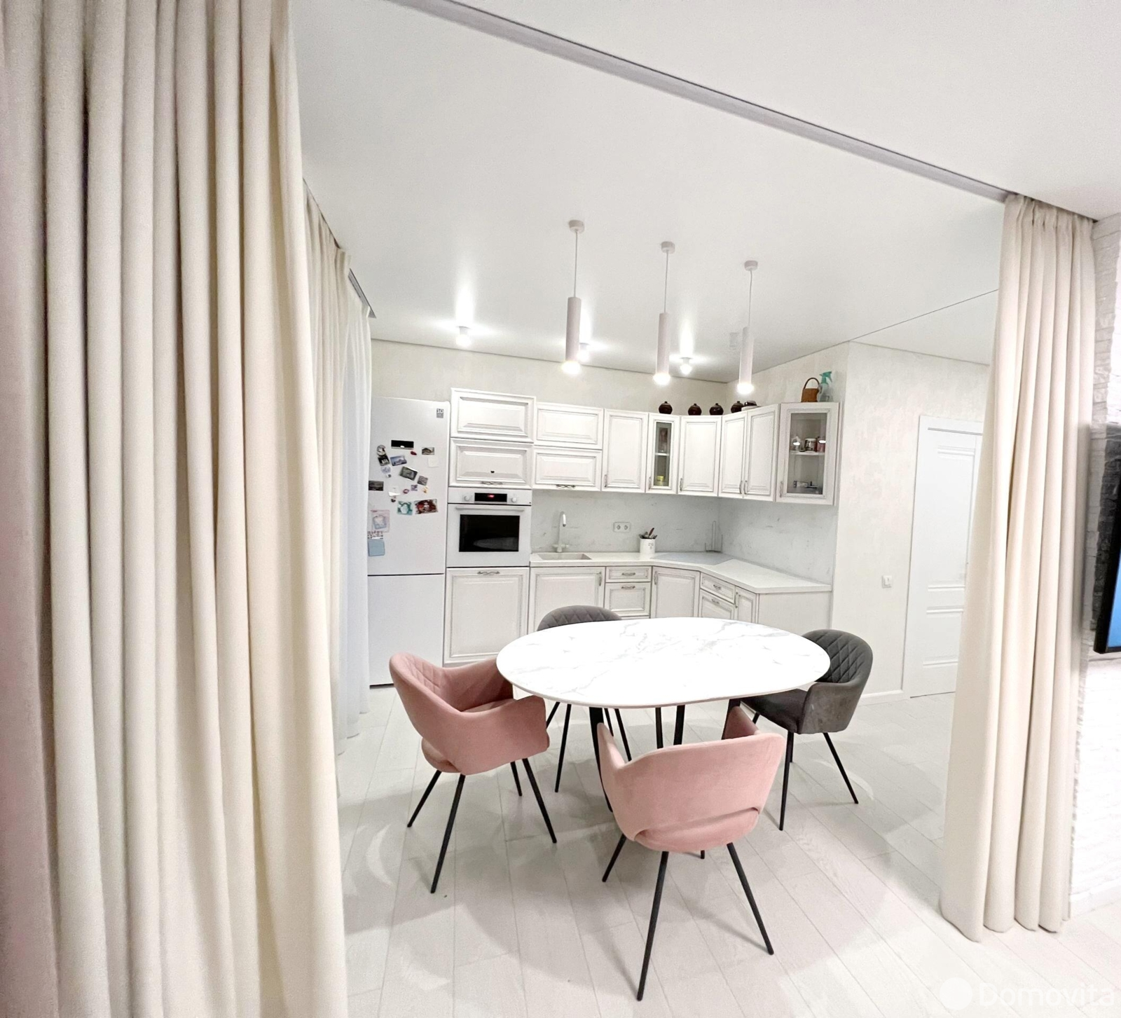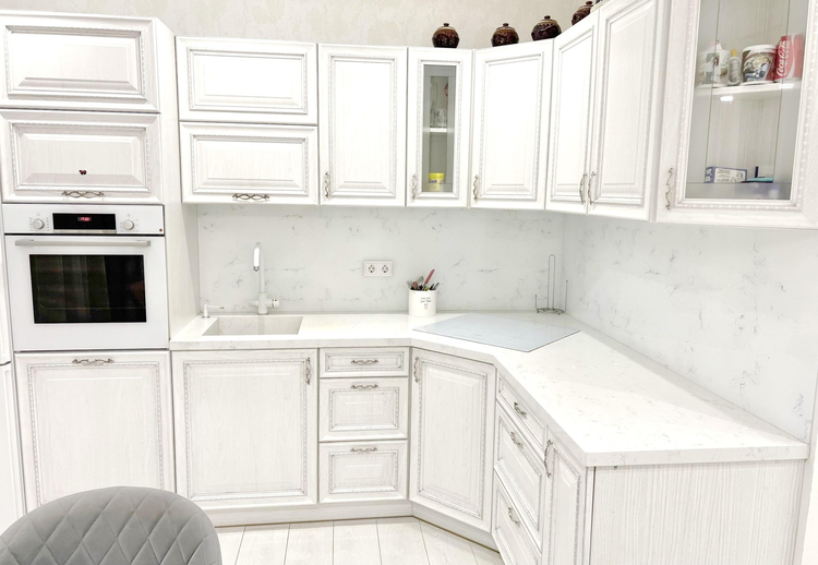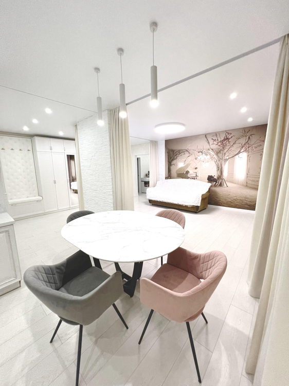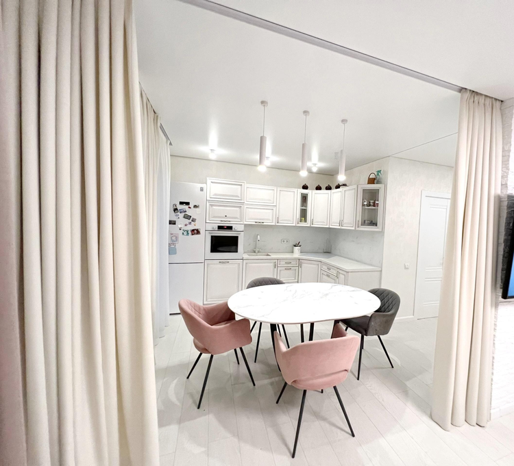 Возможность разделения кухни от общего пространства, продуманное освещение, дизайнерская столешница из кварцевого агломерата с интегрированной мойкой. Также дизайнерские скинали из обесцвеченного стекла с идентичным изображением рисунка столешницы. Встроенная техника премиум- класса (BOSCH): духовой шкаф, индукционная плита.