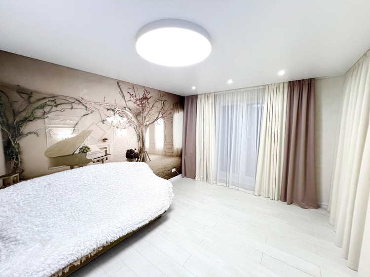 В спальне эксклюзивная, бесшовная, 5-метровая фреска под заказ из Москвы от ведущей фирмы “AFFRESCO”.