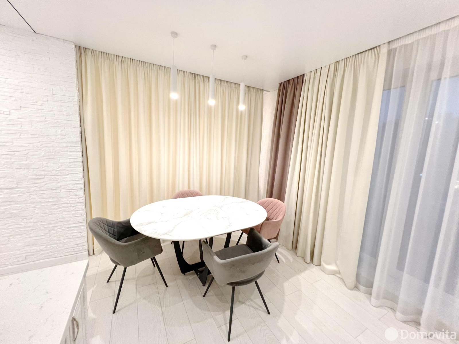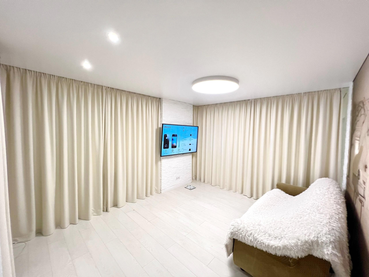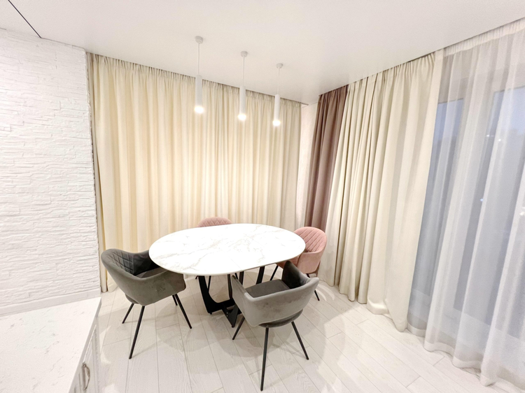 Качественный и элитный текстиль от создают непередаваемый уют и красоту. Использован для зонирования, двойные полотна не пропускают свет. Уютные и стильные шторы в спальнях. Прекрасный, дизайнерский ход соединения полотен в гостиной.