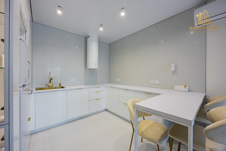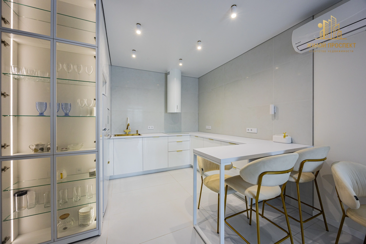 Продуманная и функциональная кухня оборудована посудомоечной машиной, духовым шкафом, варочной поверхностью, СВЧ. Подсветка рабочей зоны и удобная обеденная группа