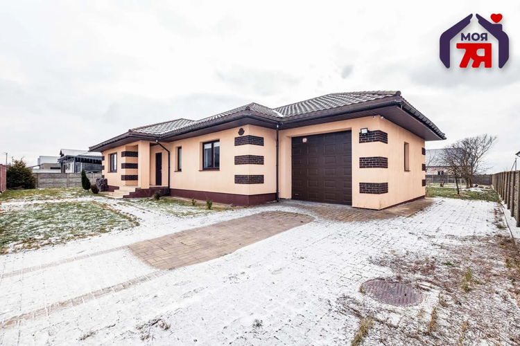 В доме расположена кухня – гостиная с выходом на крытую террасу, спальня, детская комната, гостевая комната, раздельный сан. узел, из прихожей выход в гараж( ворота с подъемным механизмом).