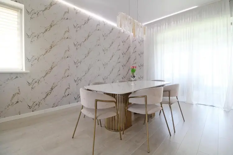 -Интерьер выполнен с использованием премиальных итальянских материалов, а мебель изготовлена на заказ, что подчеркивает индивидуальный стиль и продуманность пространства.