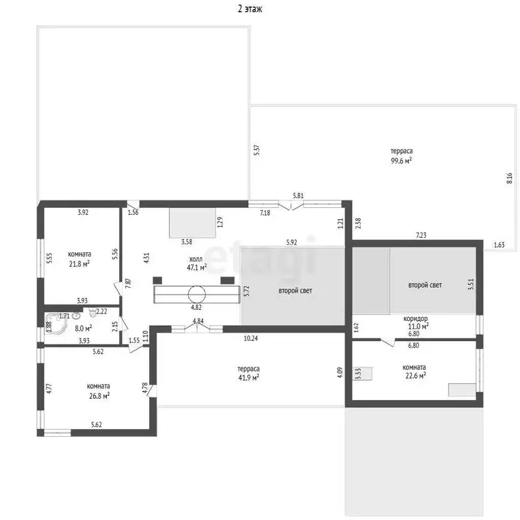 На втором этаже две большие жилые комнаты, санузел и коридор с выходами на террасы.