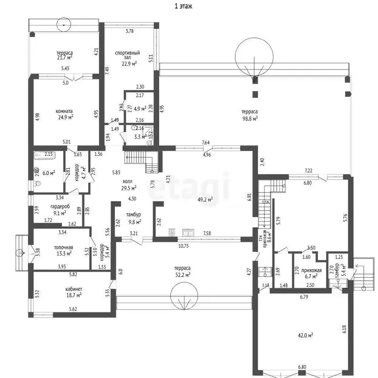 В основной же части дома, на первом этаже располагается ещё большей площади двусветная кухня-гостиная (49 кв.м.), просторная жилая комната с отдельной террасой, кабинет, холл с расположенной в нем межэтажной лестницей, гардероб, тамбур, коридор и топочная с отдельным входом, большой совмещённый санузел с естественным освещением, дополнительный санузел, помещения под сауну и спортивный зал.