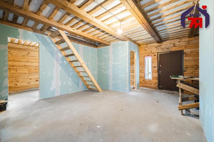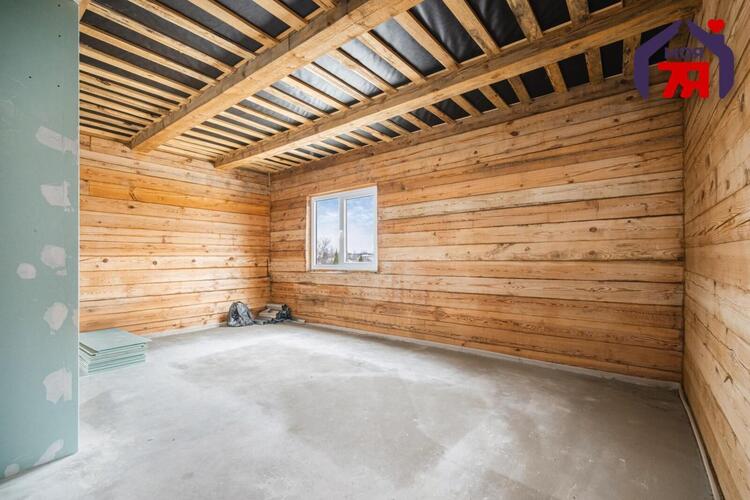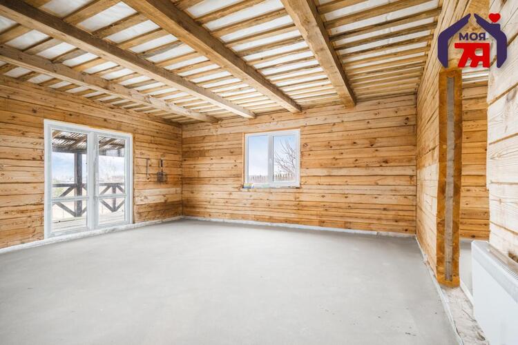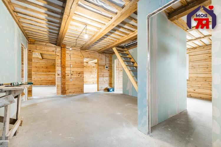 - На первом этаже выполнена бетонная стяжка, на втором — фанера, уложенная в уровень, готова к чистовой отделке. Мансарда утеплена современным материалом эковатой, который сохраняет тепло зимой и прохладу летом.