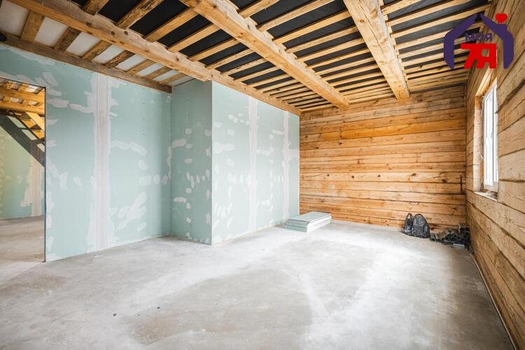 - Дом выполнен из бревна на прочном фундаменте ФБС с глубиной 1,2 м. Под полом установлены плиты перекрытия, что обеспечивает дополнительную устойчивость.