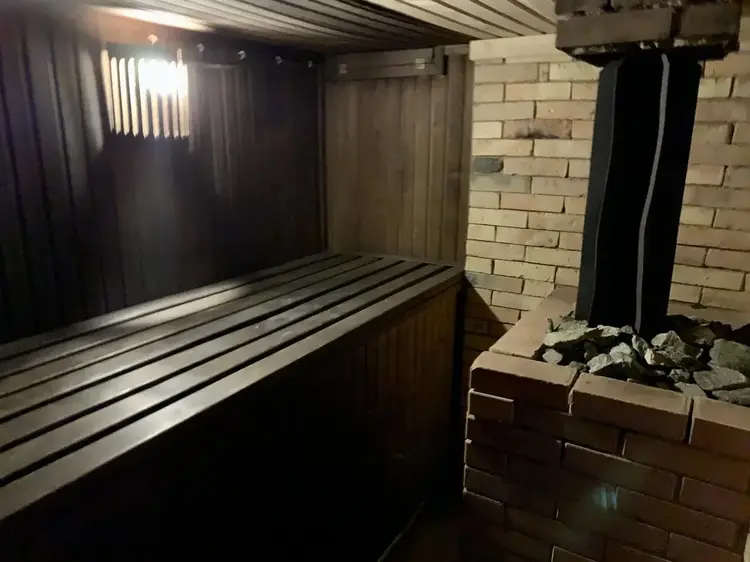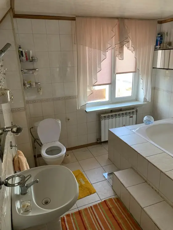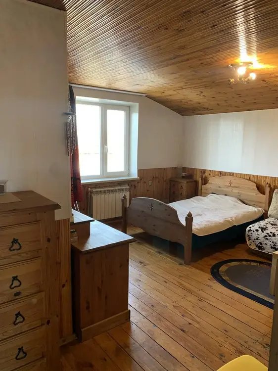 Сан. узел совмещенный, с окном и ванной джакузи. Газовое отопление и водоснабжение от собственной скважины. Два камина. Wi-fi. Просторный цокольный этаж на весь дом. Застекленная веранда на входе. К дому пристроен навес для парковки автомобиля и хранения дров. На участке (25 соток) сделан водоём, есть беседка, детская площадка и много незадействованного пространства.