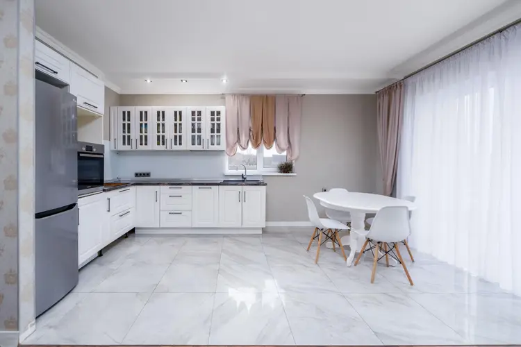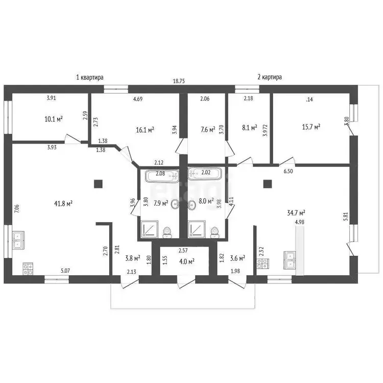Таунхаус разделен на две 3-комнатные квартиры с оборудованной кухней, гардеробной и 2 санузлами. Подключено электроотопление. Покрытие пола: плитка (теплый пол), ламинат.