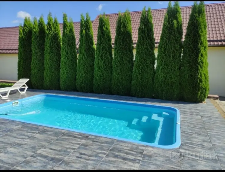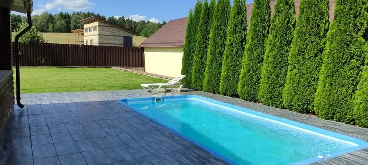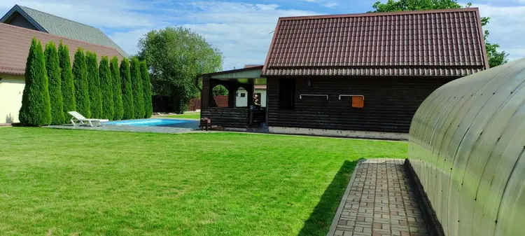 Так на участке построен гостевой дом-баня (керамзито-бетон, утеплен, отделка блок-хаус) – полностью готовый к проживанию. Возле бани расположен бассейн (3х6 м) c системой очистки, подогревом и подсветкой. Есть большая стационарная теплица для выращивания овощей.