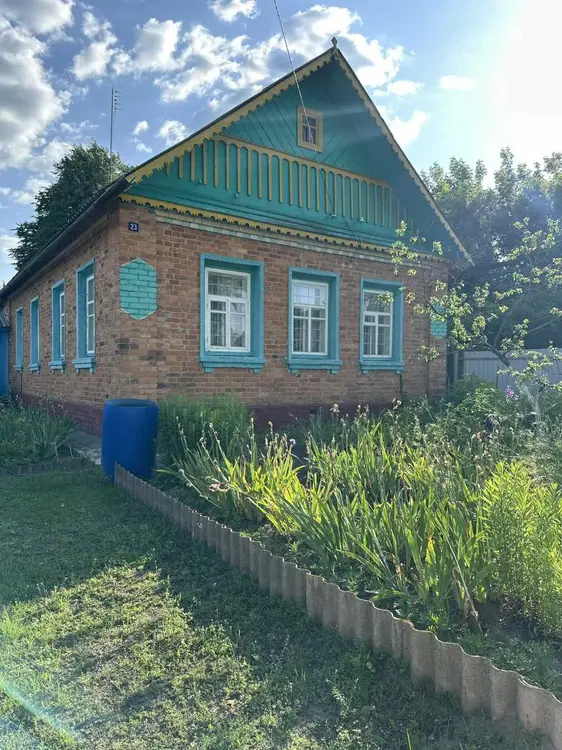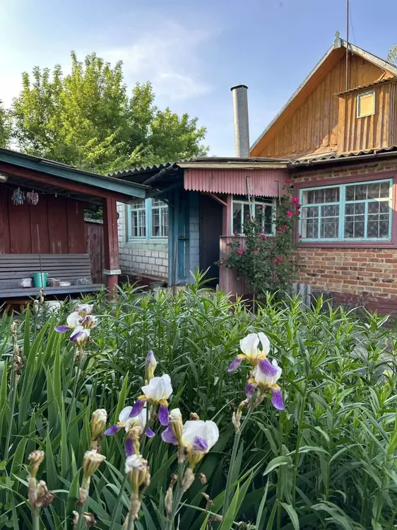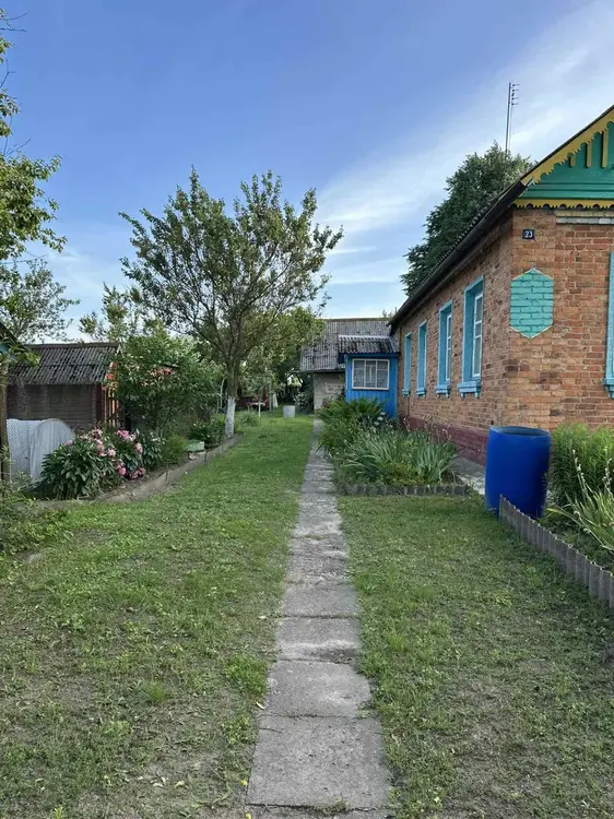 Во дворе сад с яблонями, вишнями, грушей, абрикосом, кустами черной и красной смородины, крыжовником, ежевикой, виноградом, а также клумбы с цветами.