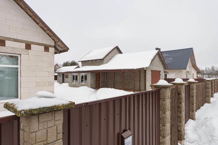 Огорожен со всех сторон металлопрофилем, установлены двое распашных ворот – для заезда в гараж и для заезда к жилому дому.