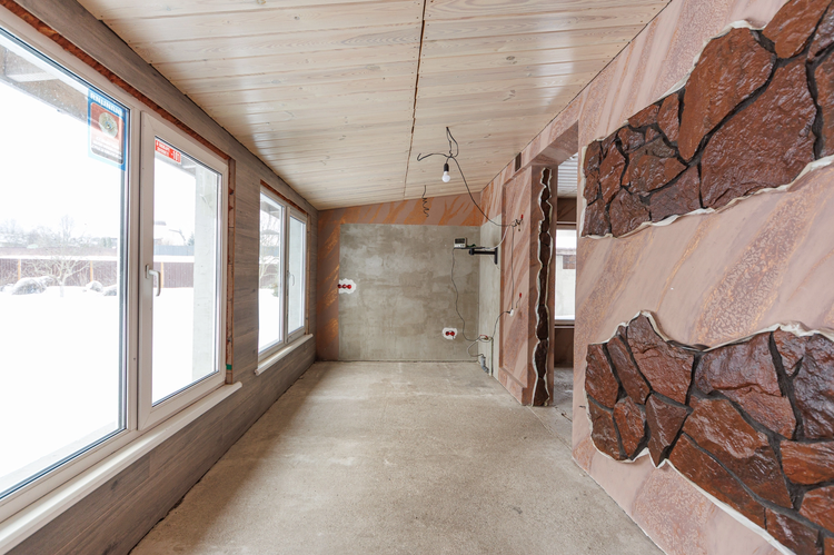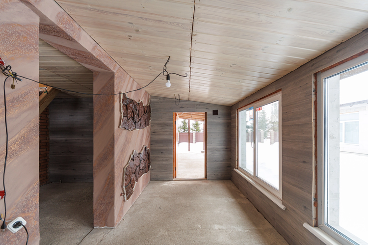 Во внутренней отделке гостевого домика использован натуральный камень песчанник, декоративная штукатурка, плитка.