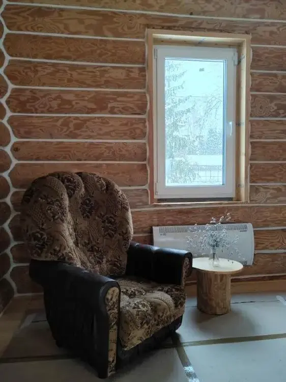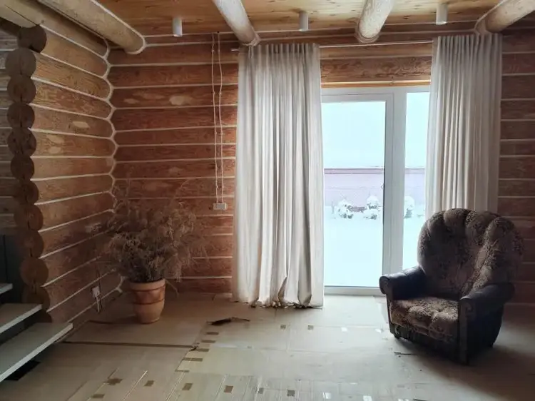 Бревенчатые стены тесаные, средним диаметром 24 см, пошлифованы и затонированы лессирующей краской снаружи и готовы к покраске внутри дома (шлифовка, матовка, грунтовка антисептиком), межвенцовые швы герметизированы по технологии "теплый шов" – комфорт и уют гарантированы!