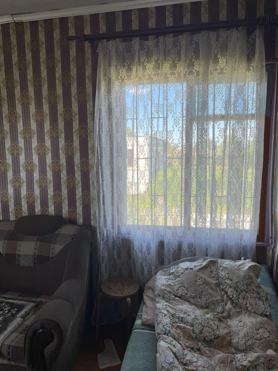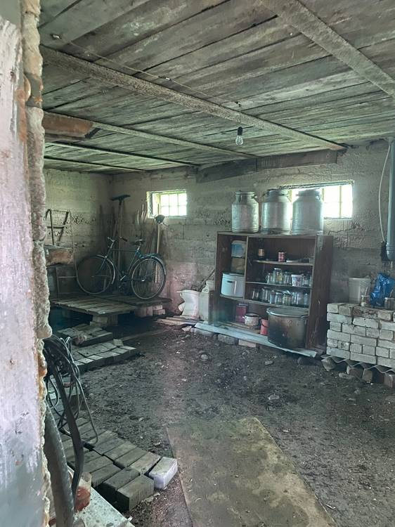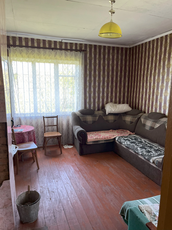 - Первый этаж – гостиная, спальня и летняя кухня. Есть мебель: кровати, диваны, столы, стулья, шкафы. Есть холодильник, посуда, газовая плита и баллон. Есть спутниковая антенна. Листы гипсокартона, некоторый строительный инструмент – для продолжения облагораживания дома. Окна деревянные.