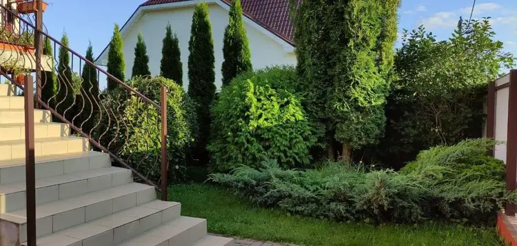 Вокруг дома очень красиво, на участке ландшафтный дизайн: дорожки выложены плиткой, высажены туи и другие декоративные растения. За домом есть аккуратная хозпостройка и сад. Все деревья (яблони, груши, сливы, вишни) и кусты - взрослые, плодоносящие. Ближе к концу участка расположены беседка и пруд, они образуют уютную зону отдыха.