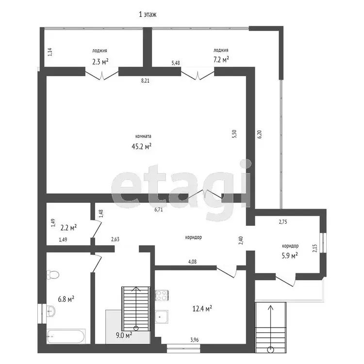 -- 1-й этаж – h 2.80m, кухня 12,4м2, гостиная 44,8м2, санузел, прихожая, кладовая, большая лоджия.