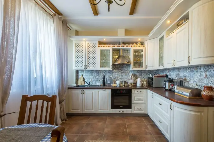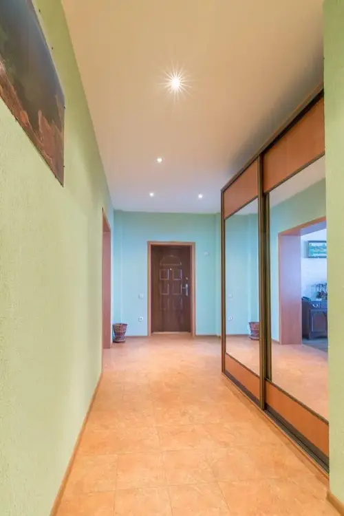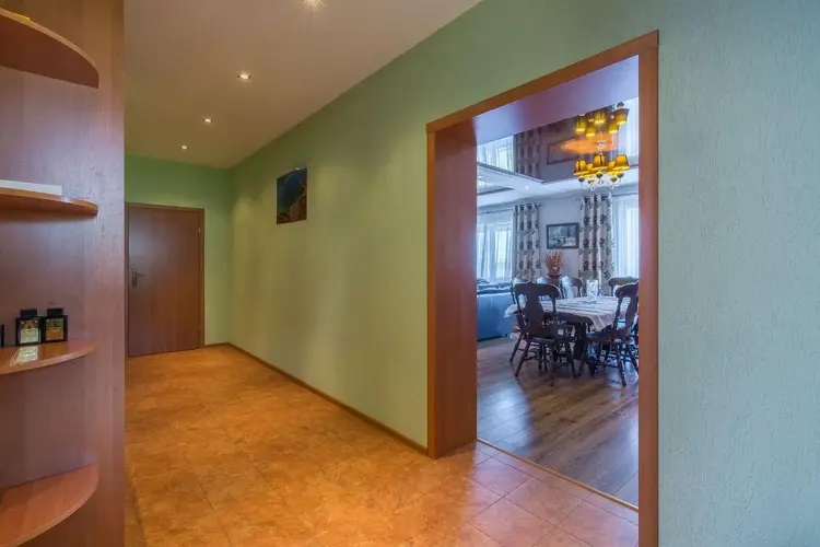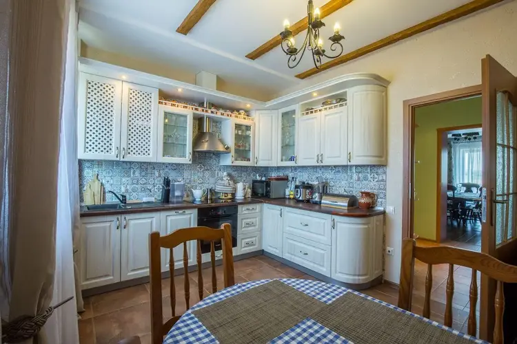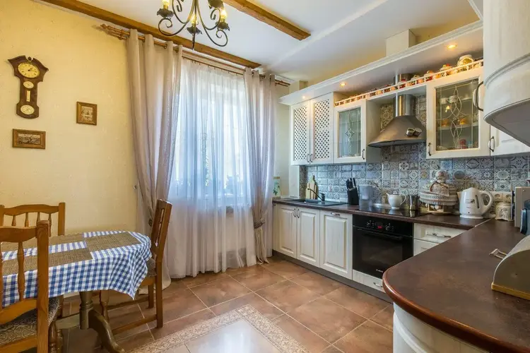 Кухня светлая и элегантная, оборудована техникой BOSCH: индукционная плита, посудомоечная машина. Большая и шикарная гостиная в классическом стиле с камином. В коридоре, санузле и кухне полы - керамическая плитка с подогревом. На мансардный этаж ведёт лестница из массива ольхи и дуба.