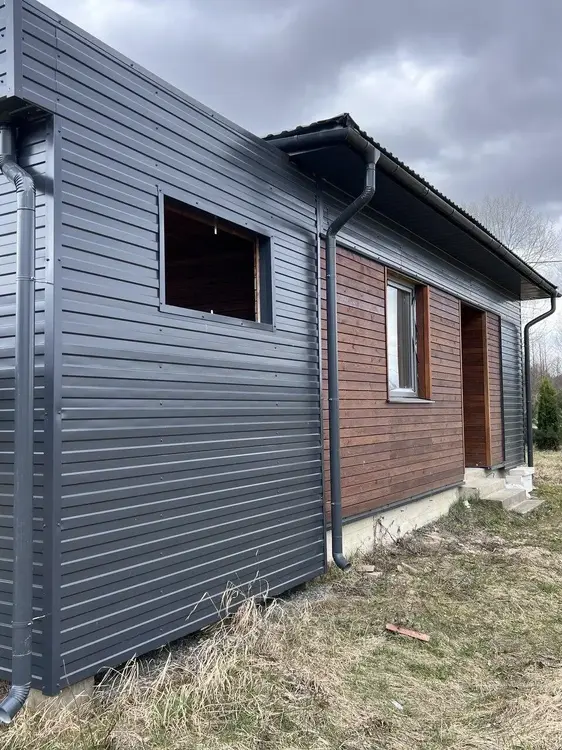 В процессе строительства — современная баня, которая станет вашим личным уютным уголком для отдыха и релаксации. А также гараж. Готова коробка, накрыты крышей, сделаны черновые потолки.