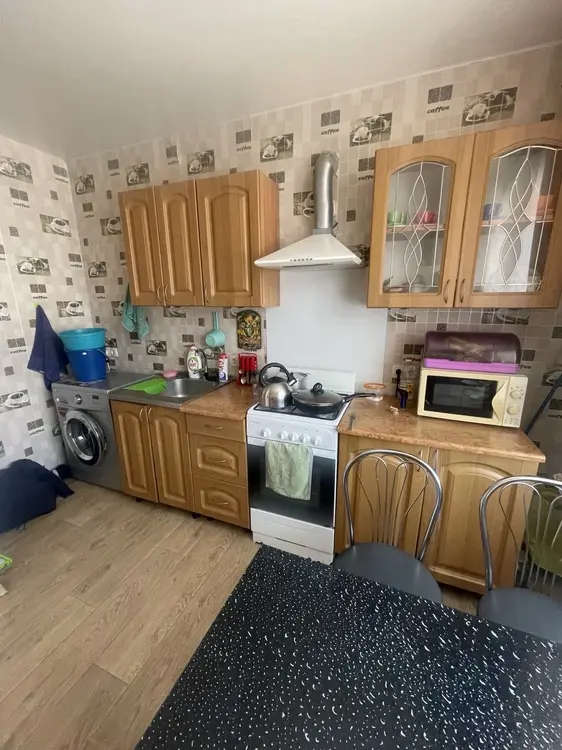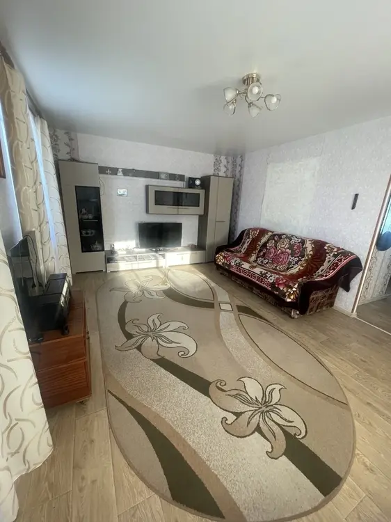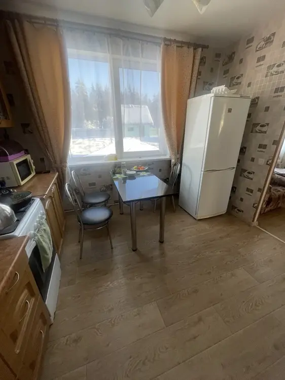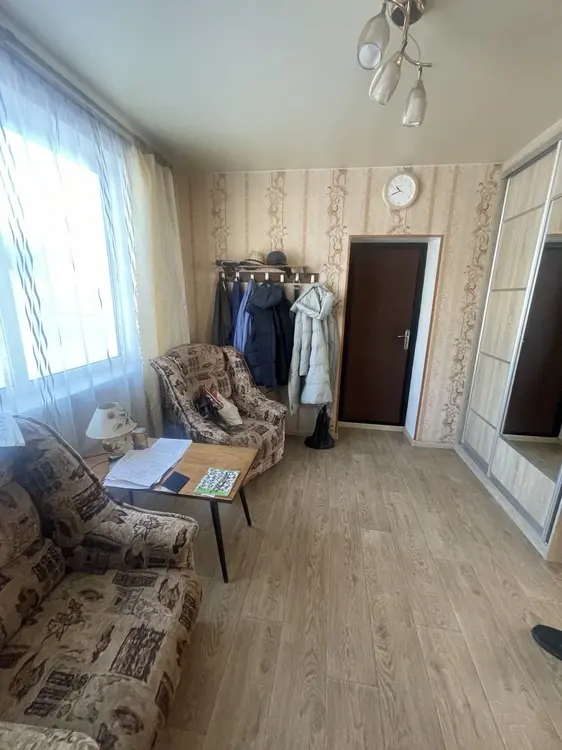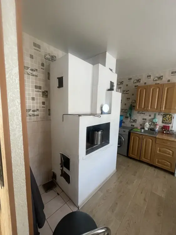 Внутреннее состояние отличное благодаря свежему ремонту: окна ПВХ, натяжные потолки, новые обои, полы из плитки и линолеума. Можно сразу въезжать и жить. Планировка включает одну большую жилую комнату, кухню, прихожую, холл и санузел.