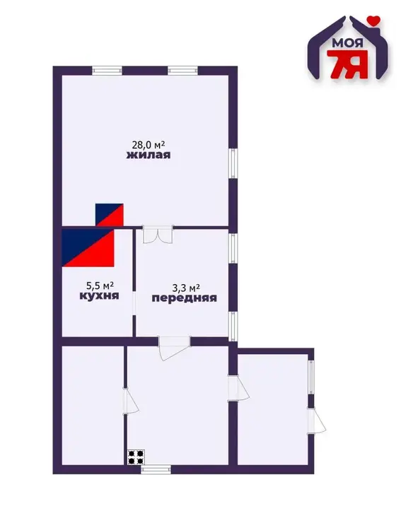 -Одноэтажный кирпичный дом, снаружи обшитый сайдингом, с кровлей из металлочерепицы — надёжно, практично и эстетично. Общая площадь составляет 45,6 кв.м., жилая — 28 кв.м.