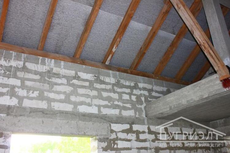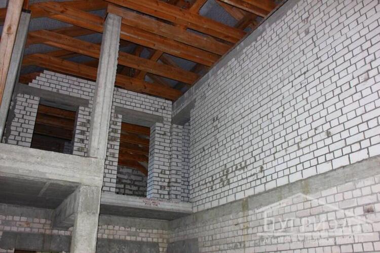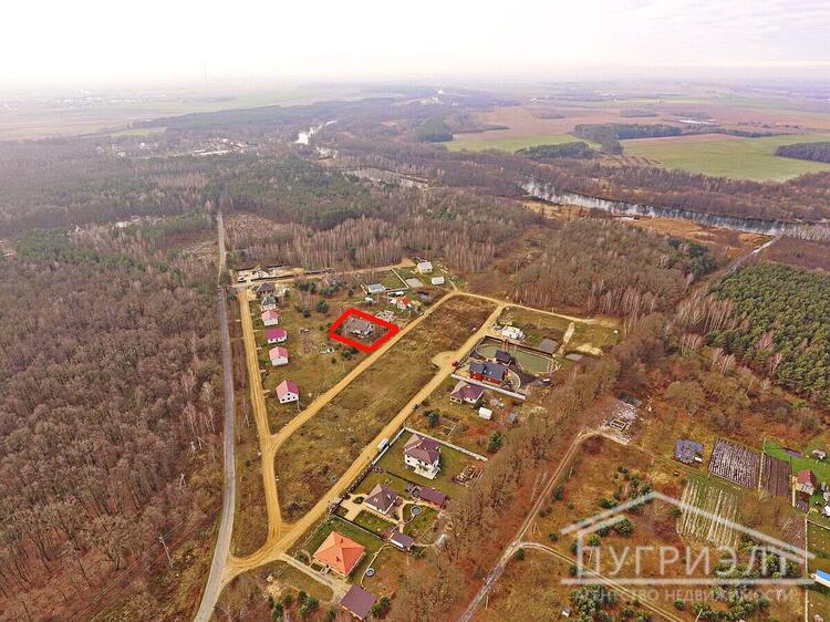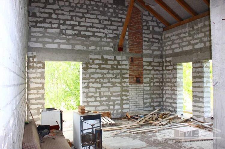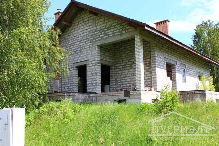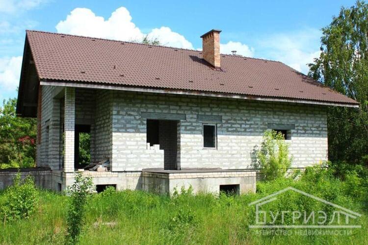 Коробка жилого дома с мансардой 2017 года постройки в д.Петровичи. Фундамент - монолитный бетон с армированием, стены - газосиликатный блок. Крыша - двускатная стропильная из хвойных пород, кровля - цементно-песчаная черепица. Внутренние несущие стены и межкомнатные перегородки из блоков, перекрытие - монолитное. Общая площадь 307.9 кв.м., жилая - 82.34 кв.м. Разработан дизайн-проект для двухуровневого жилого дома с цокольным этажом. Функциональная планировка: на первом этаже расположены спальная комната, кухня 9.61 кв.м., гостиная 41.57 кв.м. с выходом на террасу и санузел; в мансарде - просторная спальня, санузел и вспомогательные помещения. Предусмотрен второй свет. Гараж со смотровой ямой примыкает к дому. В цоколе находятся помещения под бильярдную и кладовые, имеется внутренний переход в дом. Коммуникации: электричество - электрощиток на участке; водоснабжение - скважина. Земельный участок площадью 0.1550 га удобной формы. На территории растут пышные хвойные и лиственные деревья. Лот 220344