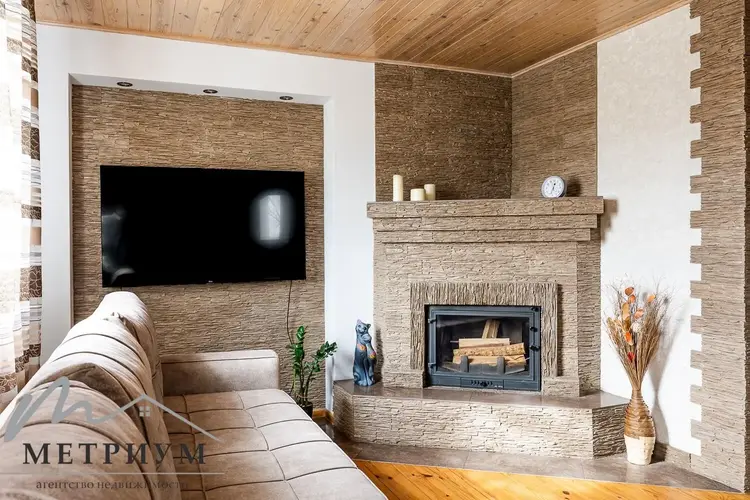 На 1-ом этаже находится большая гостиная с большим удобным для отдыха диваном, креслами и настоящим уютным камином, где будет удобно и тепло собраться с друзьями. Просторная кухня-столовая, оборудованная современной техникой, большой рабочей зоной для готовки и столовой зоной соберет по вечерам всю вашу семью за вкусным ужином. Также на первом этаже есть баня с оборудованной душевой.