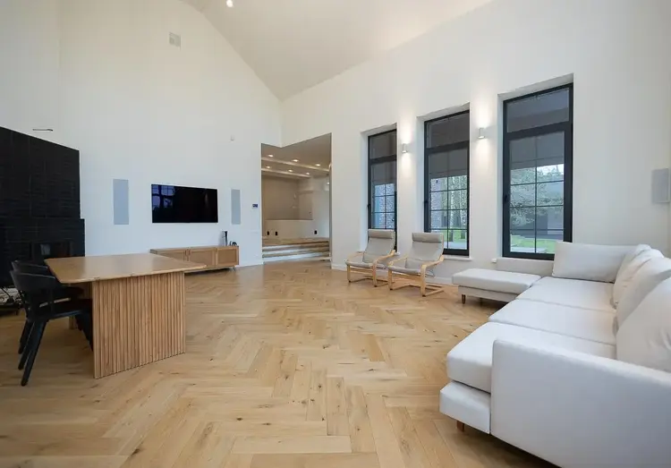 - Спроектирован опенспейс гостиной-кухни-столовой с панорамными окнами, которые открывают красоту природы в разное время года;