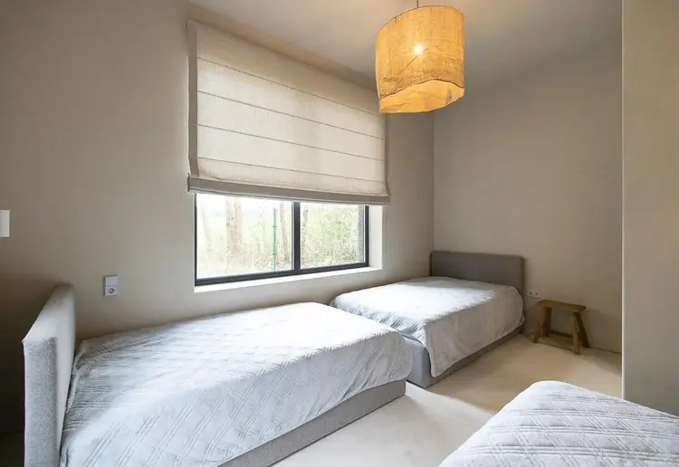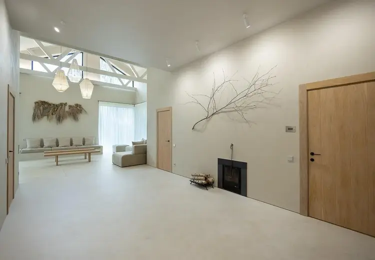 Интерьер выстроен в единой палитре, что делает пространство лаконичным и уютным. Во всех помещениях, кроме хаммама и русской бани, в отделке использован микроцемент. Датские стулья дизайна Ханса Вегнера, Сarl Hansen & Son, органично вписались в белорусский деревенский интерьер. Как и приставные столики-пеньки Gervasoni. Все столярные изделия, обеденный стол и лавки из дуба спроектированы Леной Коваленко, мягкая мебель и кровать изготовлены местной мастерской Studio Furniture. Подвесные светильники из крученой веревки – работа белорусского дизайнера. Все душевые гарнитуры и смесители – от компании Tres.