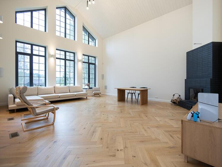 - Спроектирован опенспейс гостиной-кухни-столовой с панорамными окнами, которые открывают красоту природы в разное время года;
