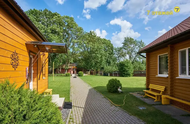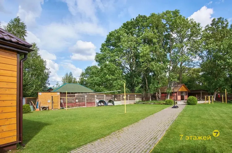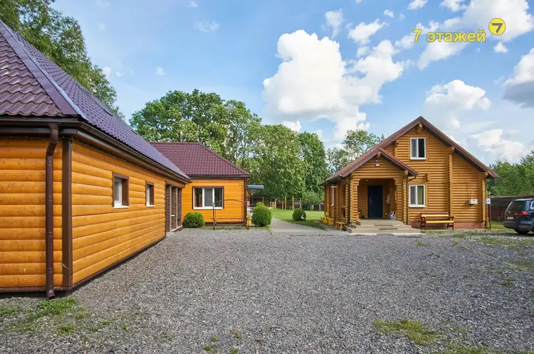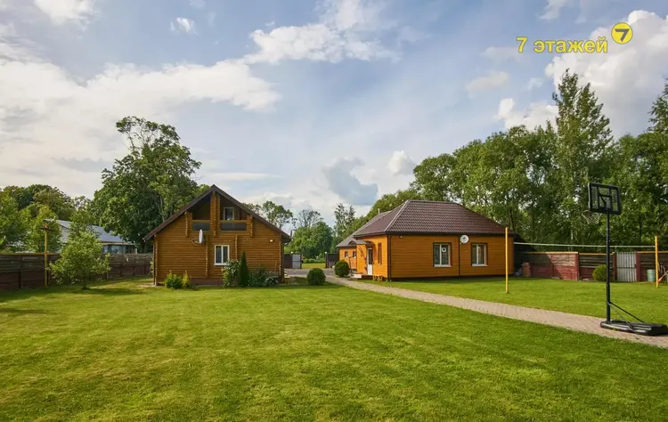 На территории находятся 3 дома и просторная беседка (зона мангала и барбекю). 2 дома для проживания с 20-ю спальными местами, третий для празднования торжеств с вместимостью до 40 человек, телевизор, система караоке, примыкает кухня, в которой есть необходимая техника, посуда. В гостевом доме имеется русская баня на дровах. Спортивная площадка для игры в футбол, волейбол, баскетбол. В 1 км от усадьбы находится зарыбленный водоём. Территория огорожена высоким забором, общая площадь трёх домов 270м.2. Участку примыкает водоём(сажалка). Фундамент свайно-ростверковый на хозяйский дом, и монолит на гостевой и торжественный.
