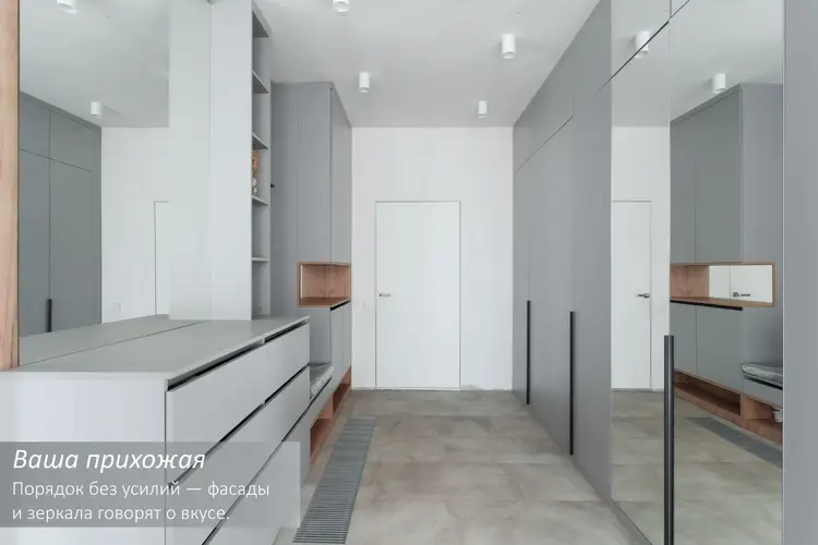 Потайные двери между кухней и гостиной — для смены ритма и масштаба пространства.