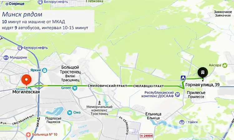 Дом в деревне Перелесье — 8,9 км от метро «Могилёвская». На машине — 11 минут. Остановка — в 10 минутах пешком. Ходят 9 автобусов с интервалом 10–15 минут.
