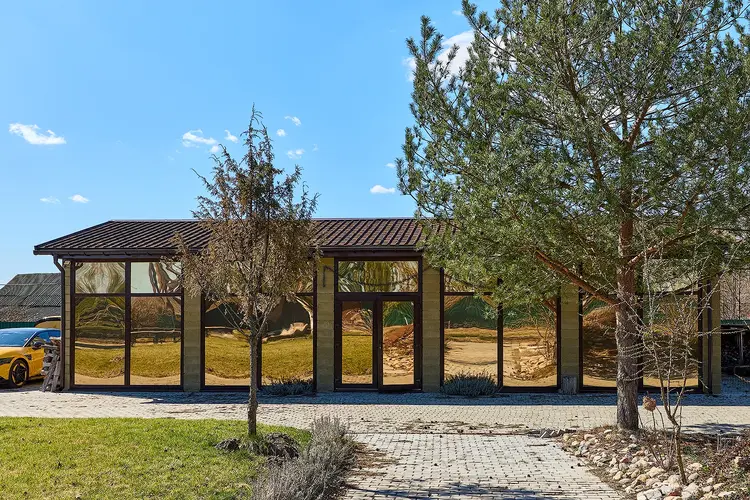 - Дегустационный зал, или просто атмосферный домик со стеклами в пол. Черепичная крыша, теплые полы, окруженный высокими туями, смотрится шикарно, размер 6/6.