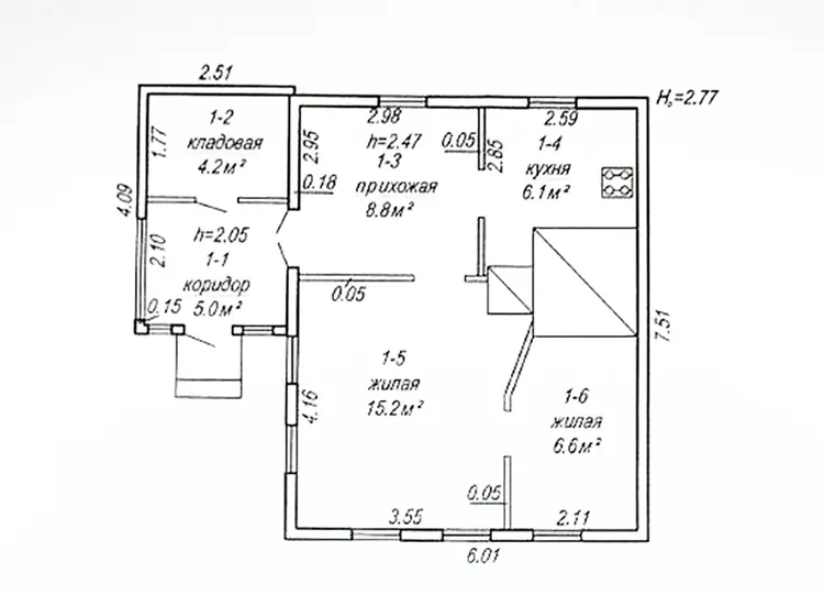 Описание дома: Одноуровневый деревянный дом 1960 года постройки общей площадью 36.4 кв. м. Планировка включает: две жилые комнаты (15.2 и 6.6 кв. м), кухню (6.1 кв. м) и прихожую (8.8 кв. м). Дом в удовлетворительном состоянии, с деревянными окнами и дверями, дощатыми полами и обоями на стенах. Отопление печное, крыша покрыта шифером.