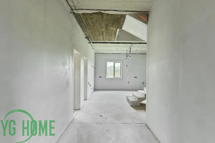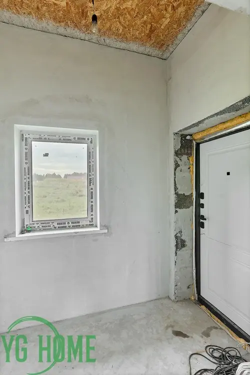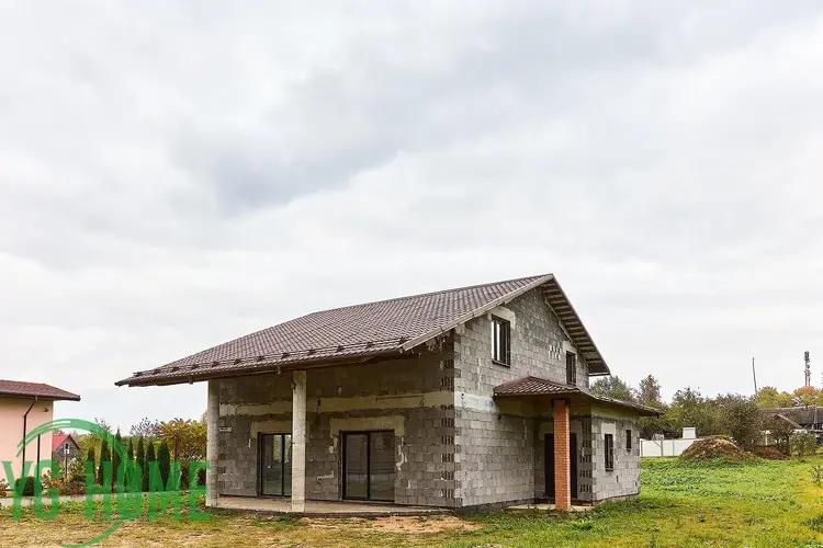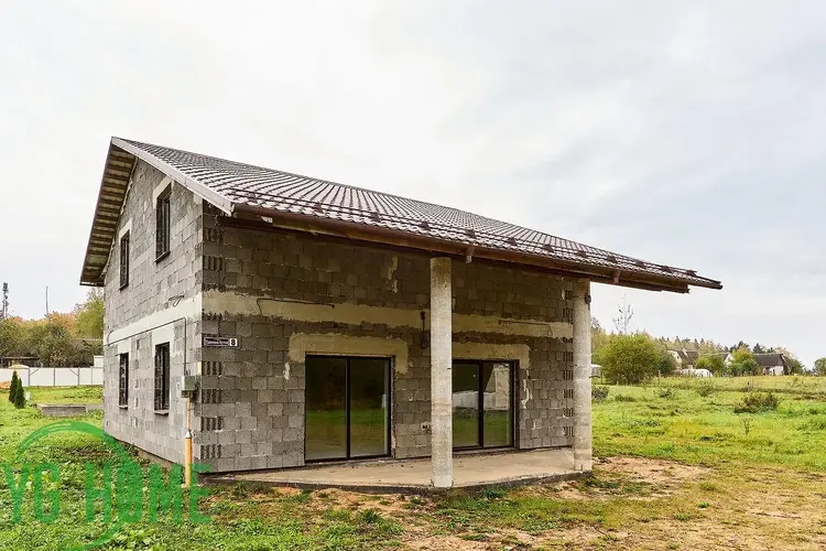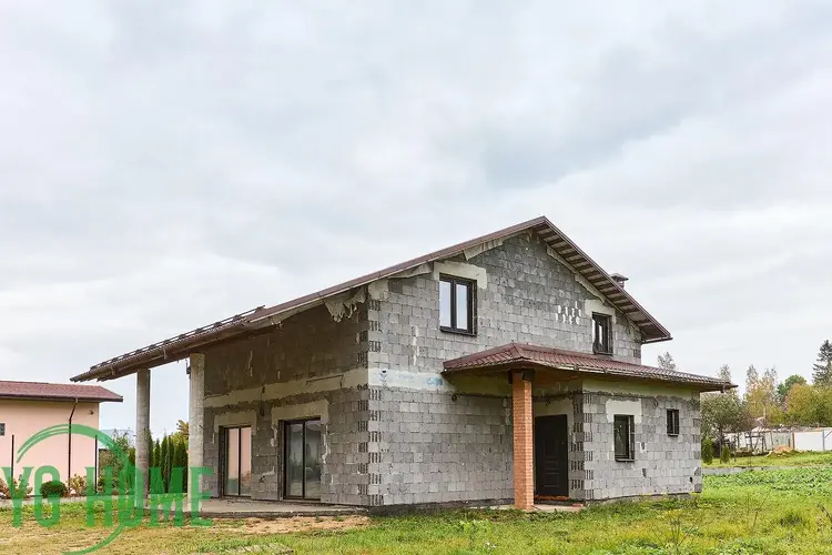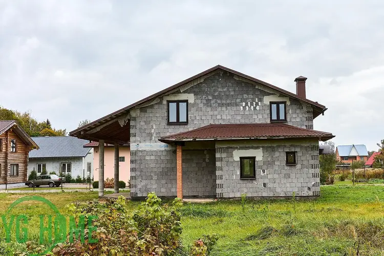 Стены возведены из керамзитобетонных блоков толщиной 400 мм. Внутри дома выровнены и оштукатурены.