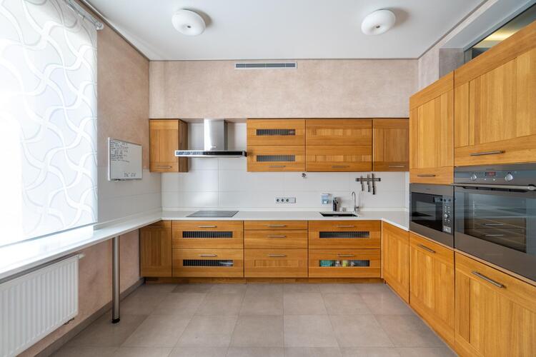 На первом этаже: удобная прихожая 24 м2. Большая гостиная - столовая 53.3 м2, (полы в зоне плитки с подогревом), с камином, большими окнами, выходом на террасу с видом на сад, кондиционер.