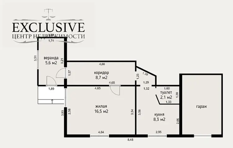 Общая площадь -60.5 кв.м. Жилая -16.5 кв.м. Кухня- 8.3 кв.м.
