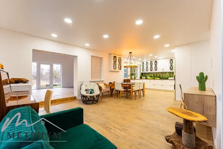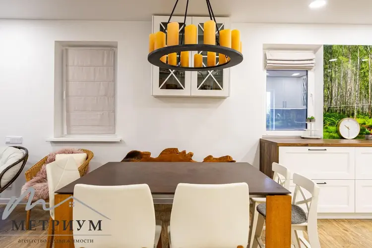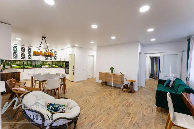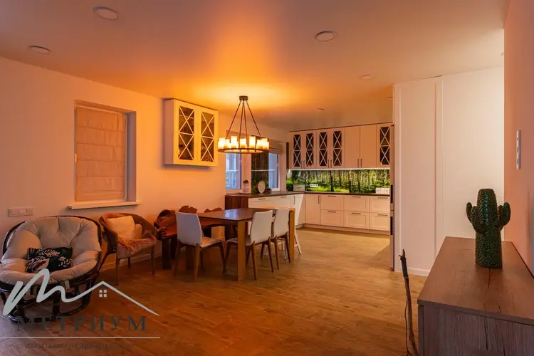 Качественная и современная отделка с использованием натуральных и долговечных материалов. В интерьере преобладают теплые оттенки, деревянные элементы и продуманное освещение, создающее уютную атмосферу. Просторная кухня-гостиная оснащена современной техникой, стильной мебелью и полностью готова к использованию.
