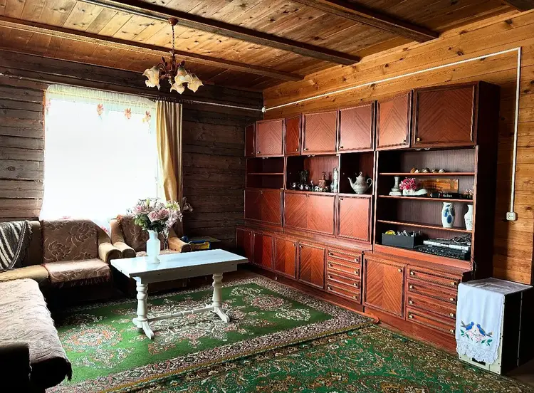 Дом двухуровневый, материал стен – качественное цельное бревно, толщиной 400мм. Кровля – шифер, ленточный фундамент, установлены окна ПВХ. Общая площадь составляет 95.7 м2, жилая – 51.5 м2, кухня – 15.1 м2. В доме на первом этаже три комнаты: просторная гостиная с камином (25.7 м2), две спальни (каждая 12.9 м2). Сердце дома – застекленная веранда (24.8 м2) с обзорным видом на участок и озеро. Есть вместительная кладовая для хранения вещей. Также можно оборудовать мансардный этаж под жилые комнаты.