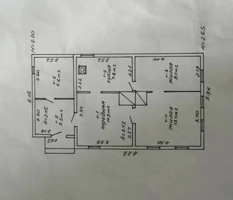 Площадь дома по СНБ (с сенями и кладовой) - 53,7м2. Общая площадь дома - 41,6м2, жилая - 22,5м2.