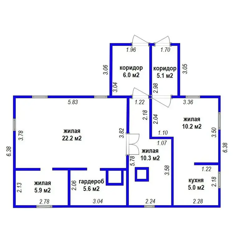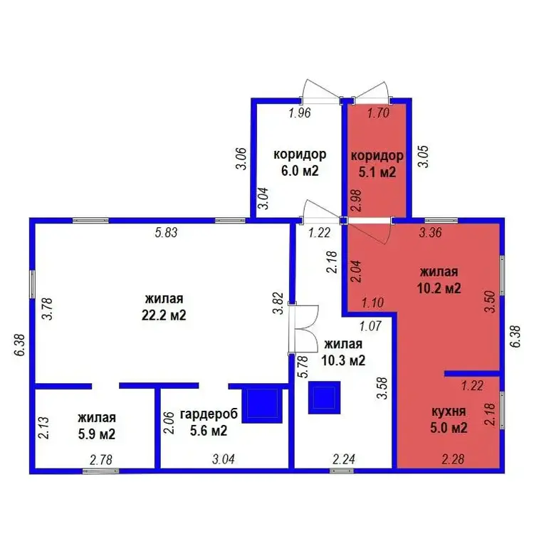 - Общая площадь дома 44,8 кв. м., жилая площадь 28,1 кв. м., площадь кухни 8 кв. м , гардероб 5,6 кв. м.