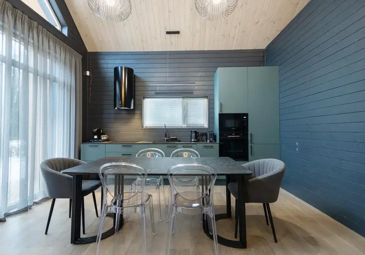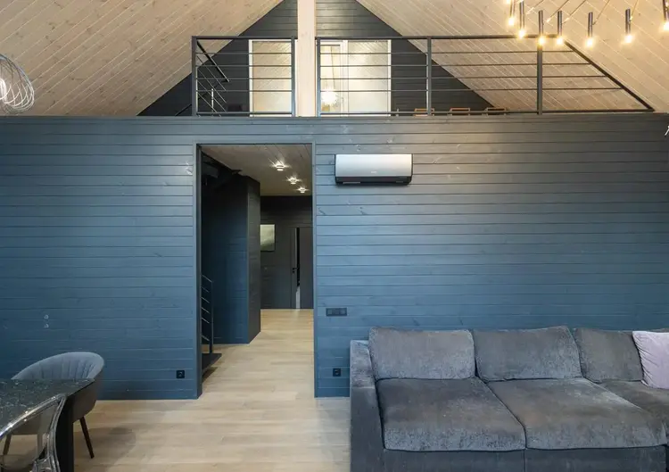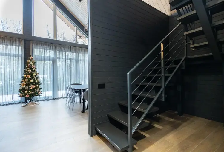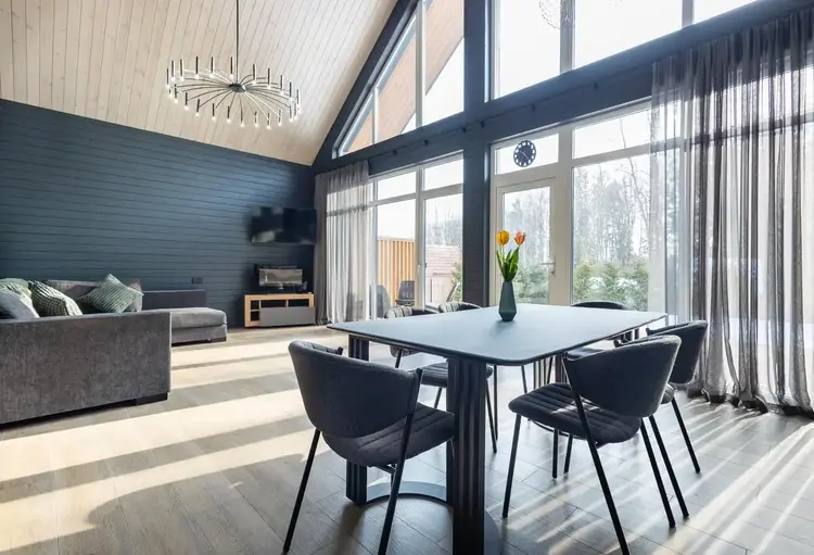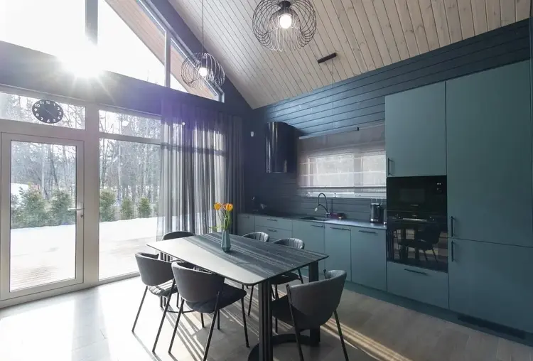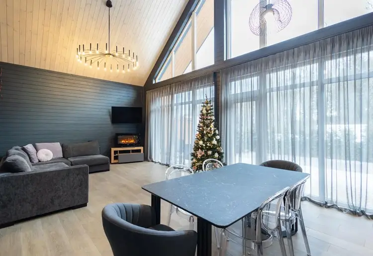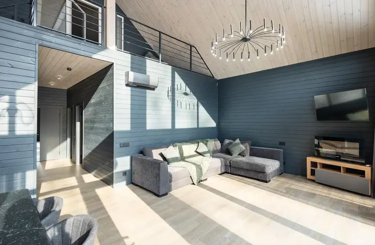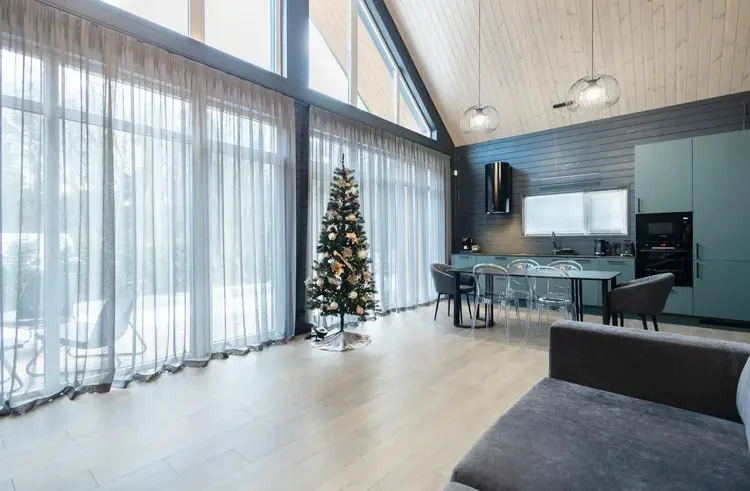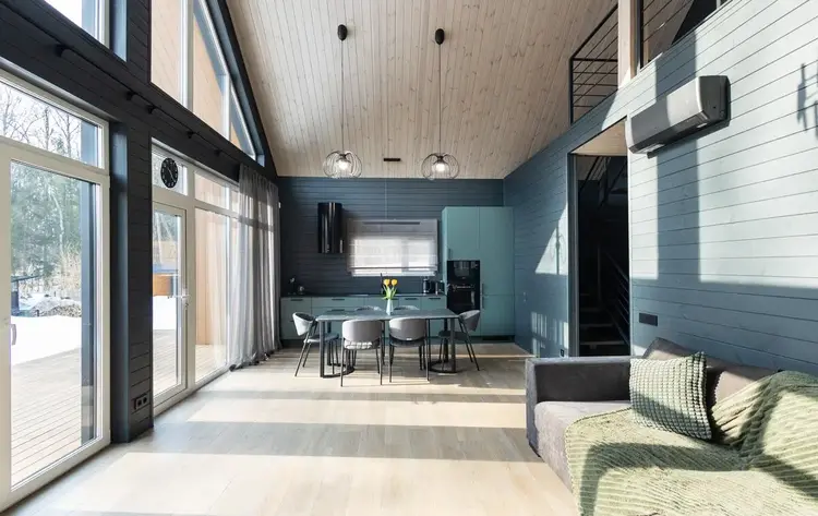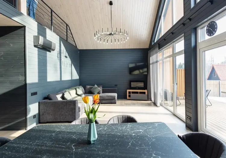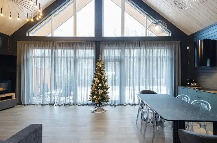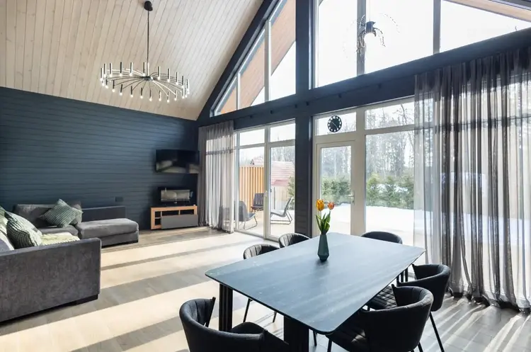 - В гостиной второй свет на всю высоту дома со стеклянной стеной - 5 метров в высоту
